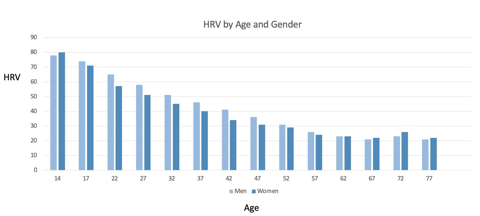 Here is a heart rate variability chart by age and gender to understand trends by age and gender. These are purposefully general and many other factors, such as genetics, diet, prescription medication, supplements, and recreational drugs can factor into your personal HRV score.